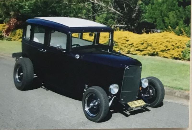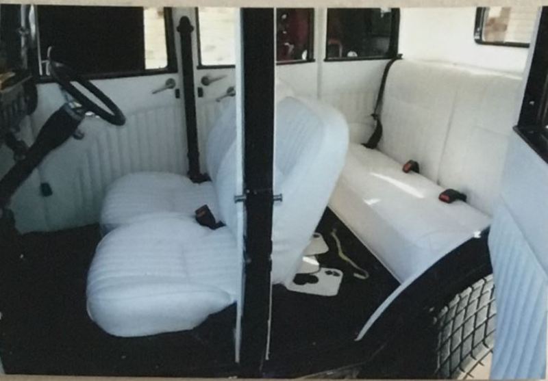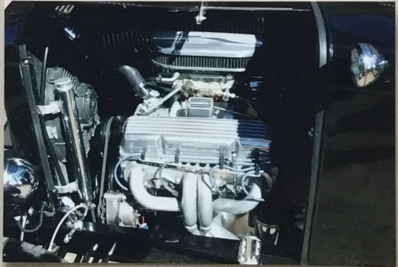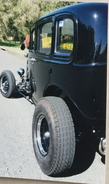 All steel, 4 dr sedan on Repo 32 chassis worked 283 polished 2 speed power glide 9 inch white marine vinyl trim magnum axle XP column 4 bar front & rear hpc coated gonzo Exhaust Firestone tyres.