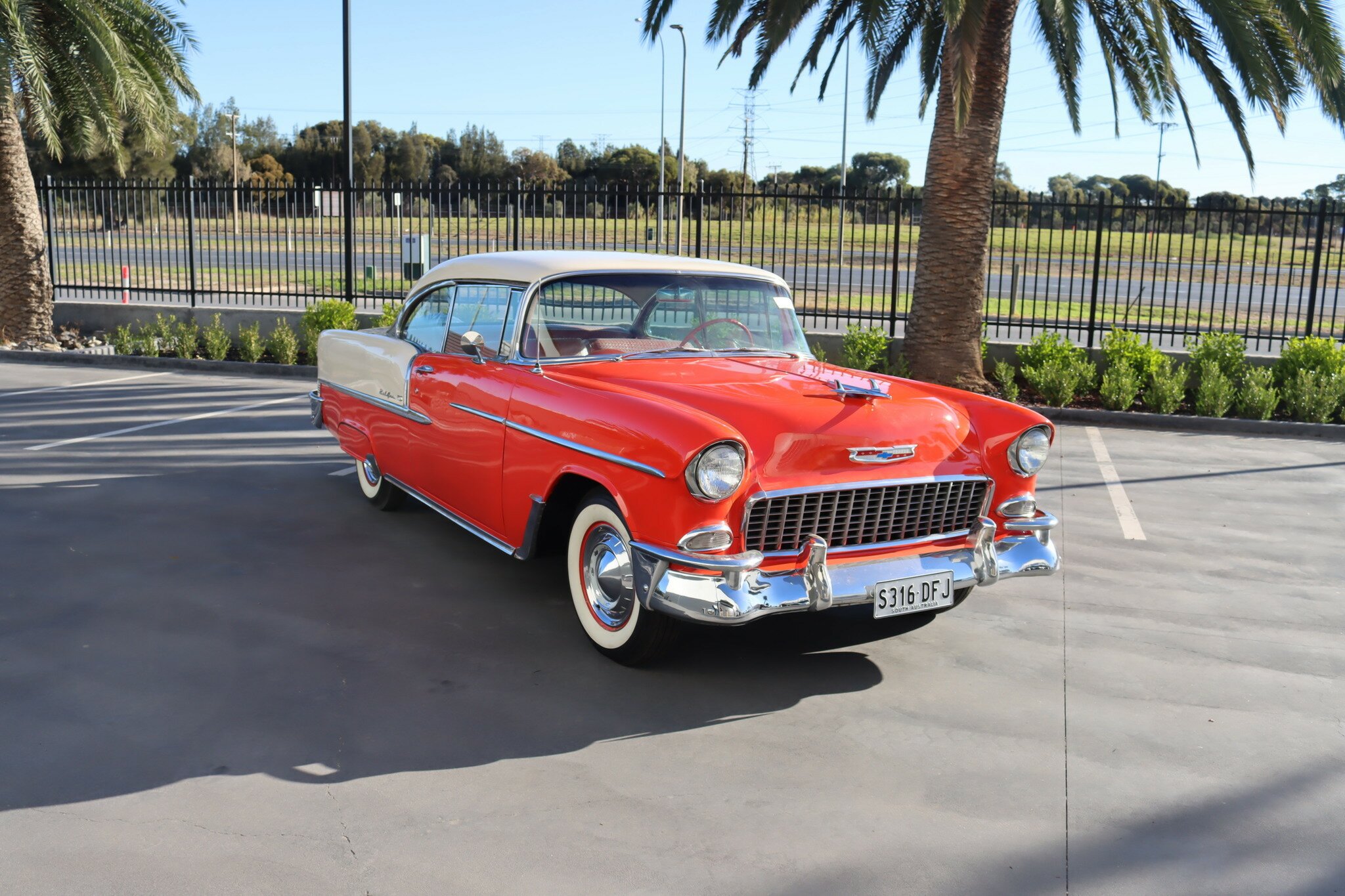 This is a very nice and sought after 55 Chev. Running the 265ci V8 and 3 speed manual trans. Presented in good quality two tone red/white exterior with matching interior. Features a continental kit, fender skirts and whitewall tyres. Older restoration showing 23,753 miles. Registered in SA.
