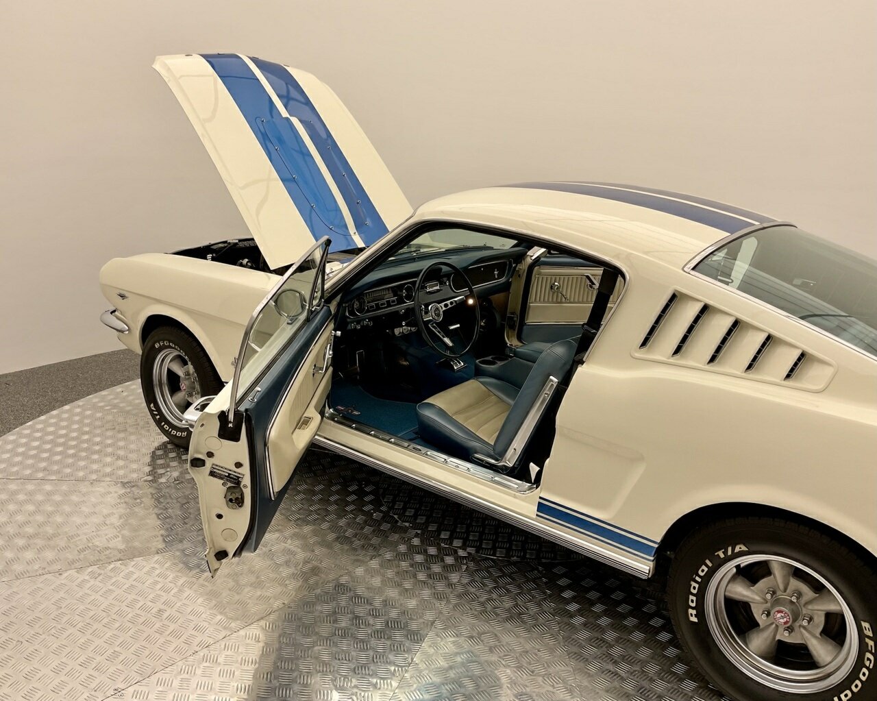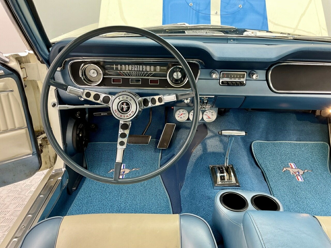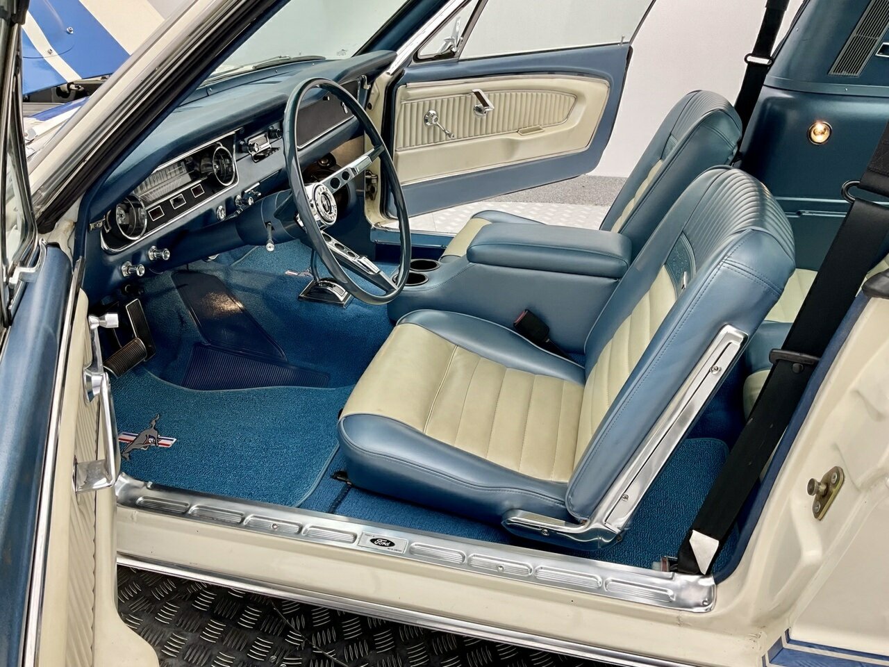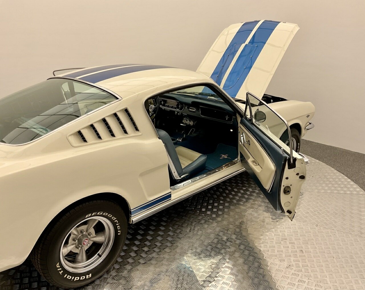 Ford Mustang Fastback 1965 Painted in Wimbledon White, with blue and white luxury pony trim. Equipped with a Ford Windsor 289 all factory matching numbers motor and Automatic transmission, and factory 8 3/4'' differential, accompanying the vehicle is a history file, owners booklet and receipts detailing mechanical work to the engine, brakes and suspension over this period, presented in its original colour combination, this Ford Mustang is in good condition both in the paintwork and exterior with a few minimum touch ups, this Pony is a turn key example and is one for the driving enthusiast. Don’t miss out on this opportunity to own this desirable American classic muscle. Left hand drive, car starts great, sound awesome with the ford rumble and drives great, it would also make a great Shelby (GT 350) replica, with a bonnet scoop, and blue sticker decal on it, it would not take much to change it. Also, the opportunity to add 1/4 vent glass, there are kits available in the USA. This pony is in very original condition, and a rust-free body.