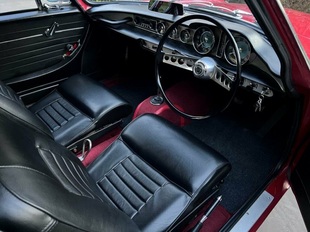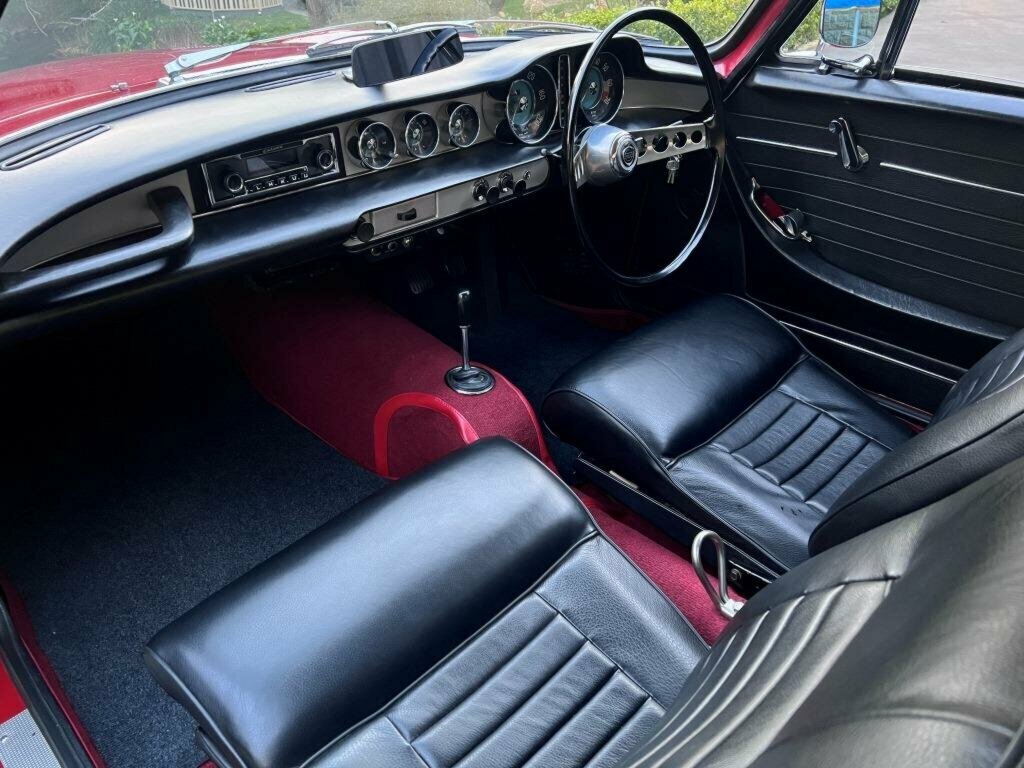 The interior has been fully restored including new black leather seat covers over new front seat foams, new seat webbing throughout, new door cards, kick panels, rear quarter trims, rear seat boards, new upper and lower dash pads and horn button attached to the original steering wheel. The original “hang up” seatbelts with centre ring hook are in place and a new accelerator pedal has been installed.
