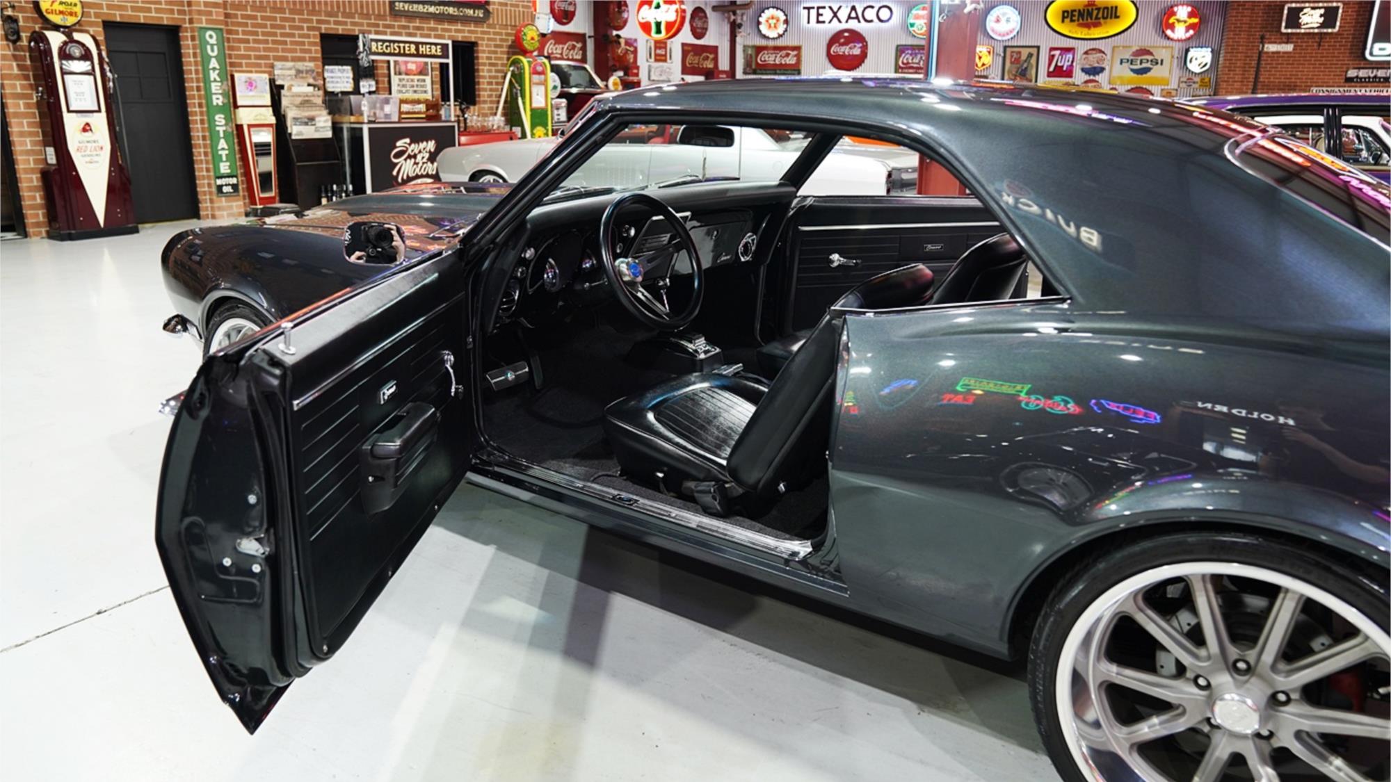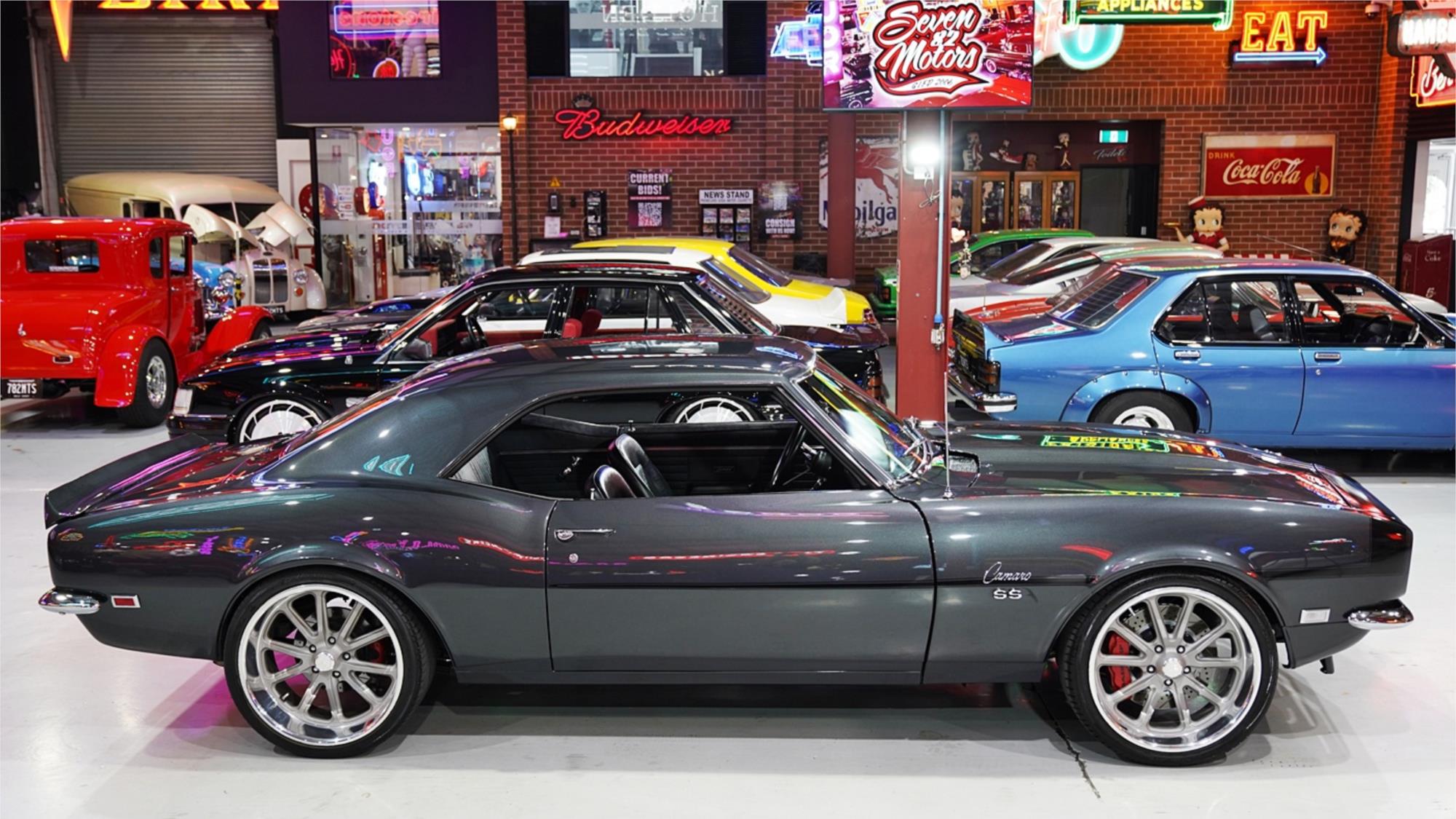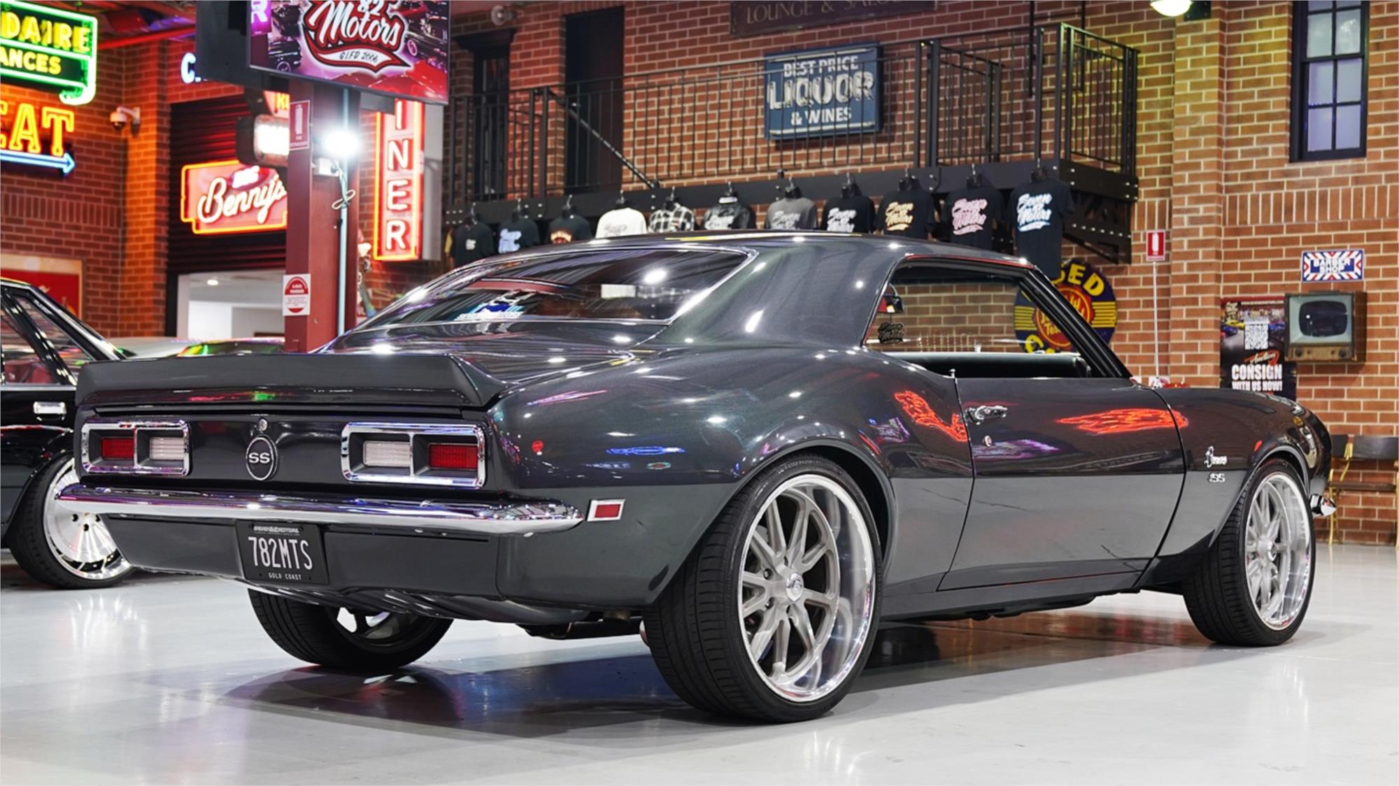 HIGHLIGHTS: - 1968 Chevy Camaro rebuilt in tough Restomod style – Repainted in Nightfall Grey metallic – Front and rear spoilers – Late model, LSA 6.2L Supercharged V8 engine, Upgraded cam and boost pulley – Turbo 400 automatic transmission with B&M shifter – Nine inch diff with 3.7 gears and Trutrac centre – Detroit Speed front suspensions upgrade – Rack and pinion power steering - Four-wheel power disc brakes with Baer six piston fronts – Custom Stainless steel exhaust - Refinished black interior trim – AutoMeter gauges – 20 inch US Mag wheels - Fitted with QLD mod plate