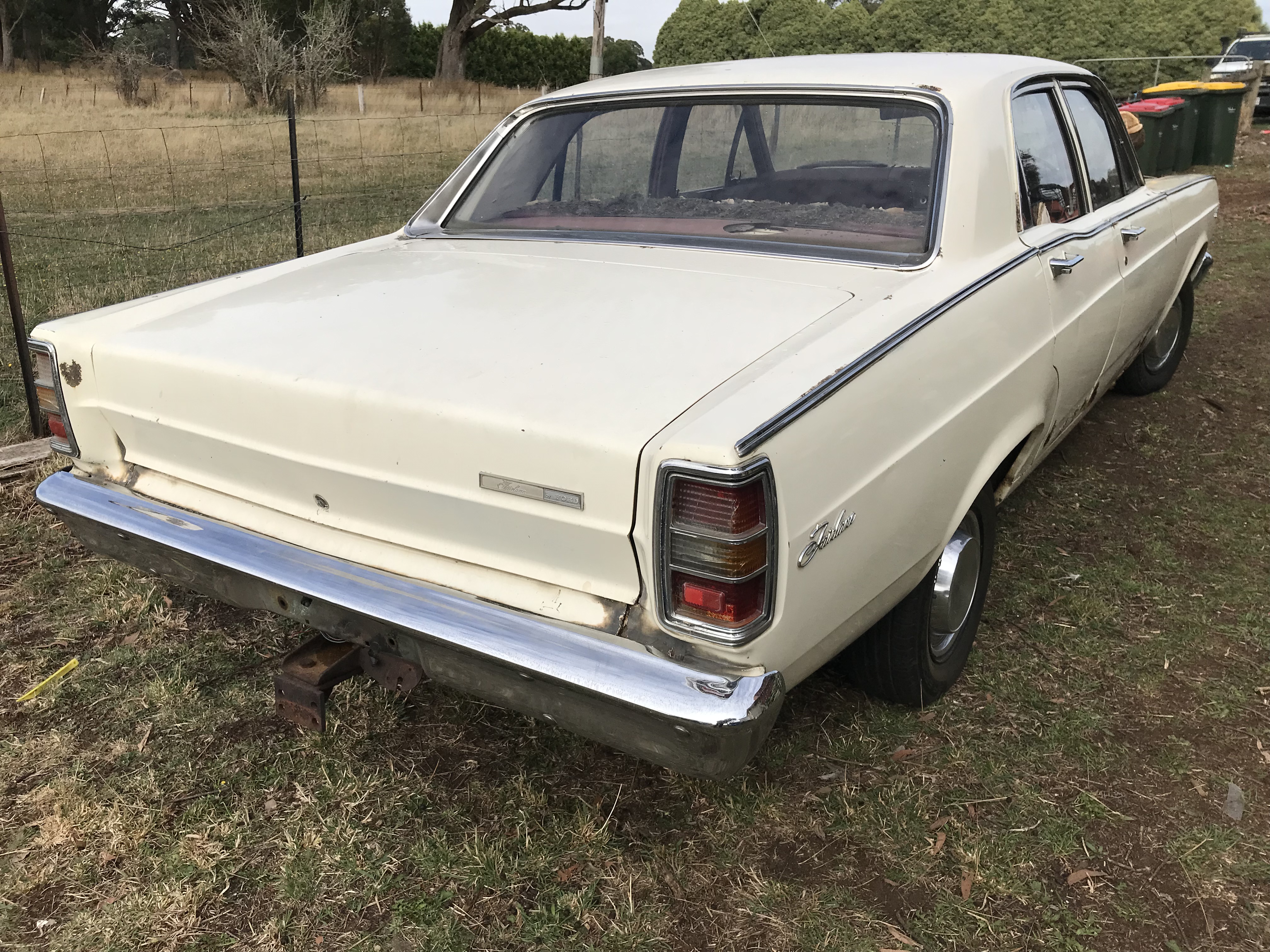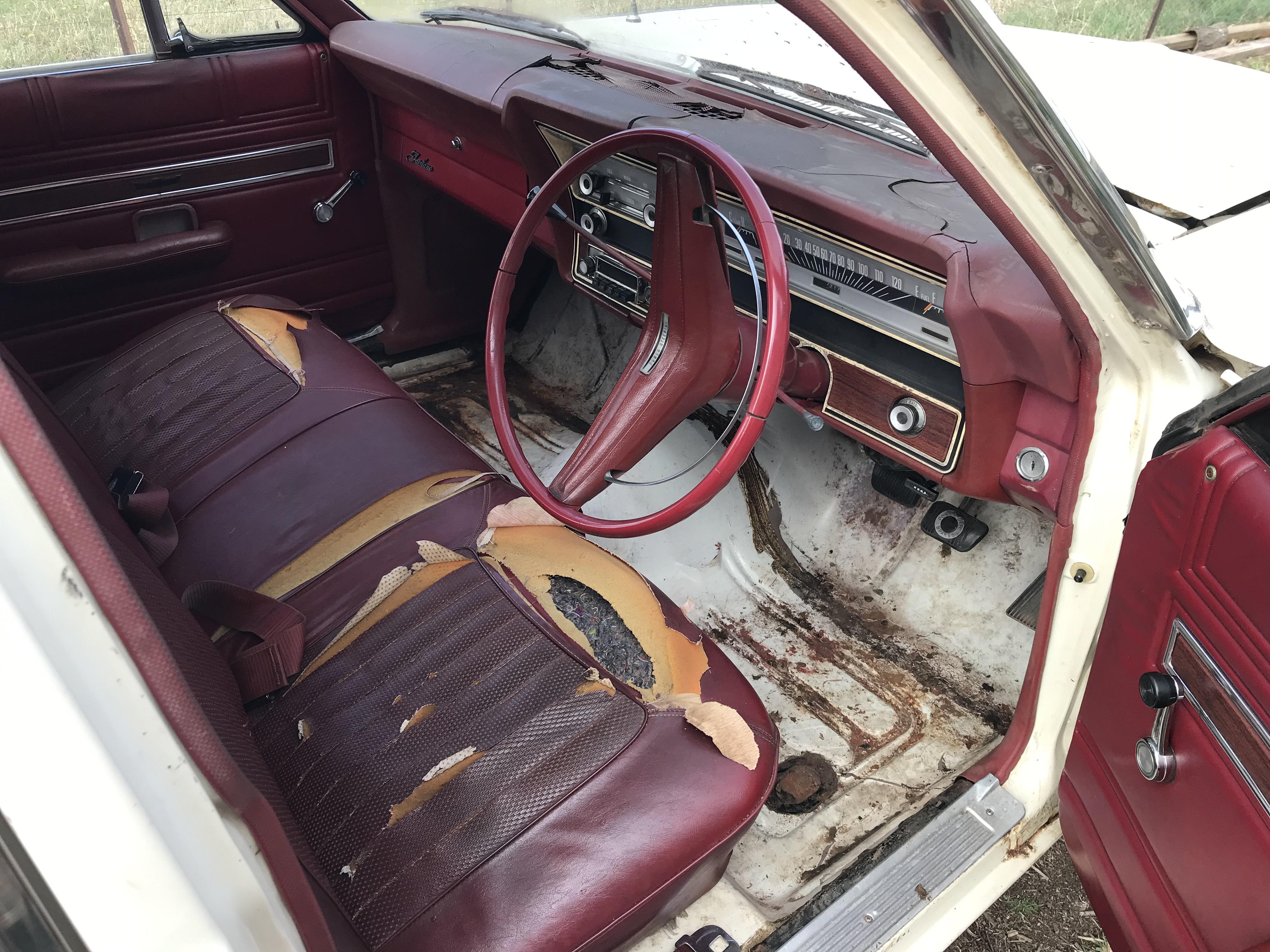 White/Cherry interior. Original 302 Windsor. 3 speed column shift manual. 98% complete car. Was running and driving, just needs electrical work fixed. Minimal rust for its age but will need some work.plz message