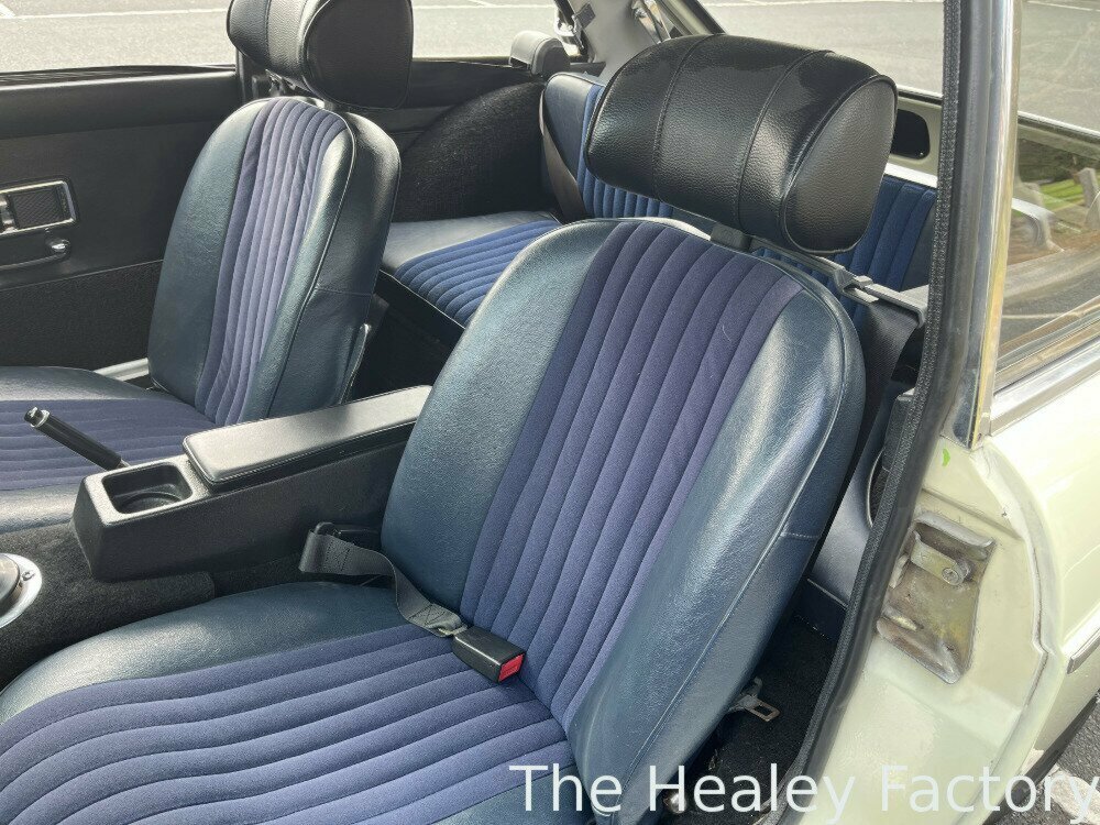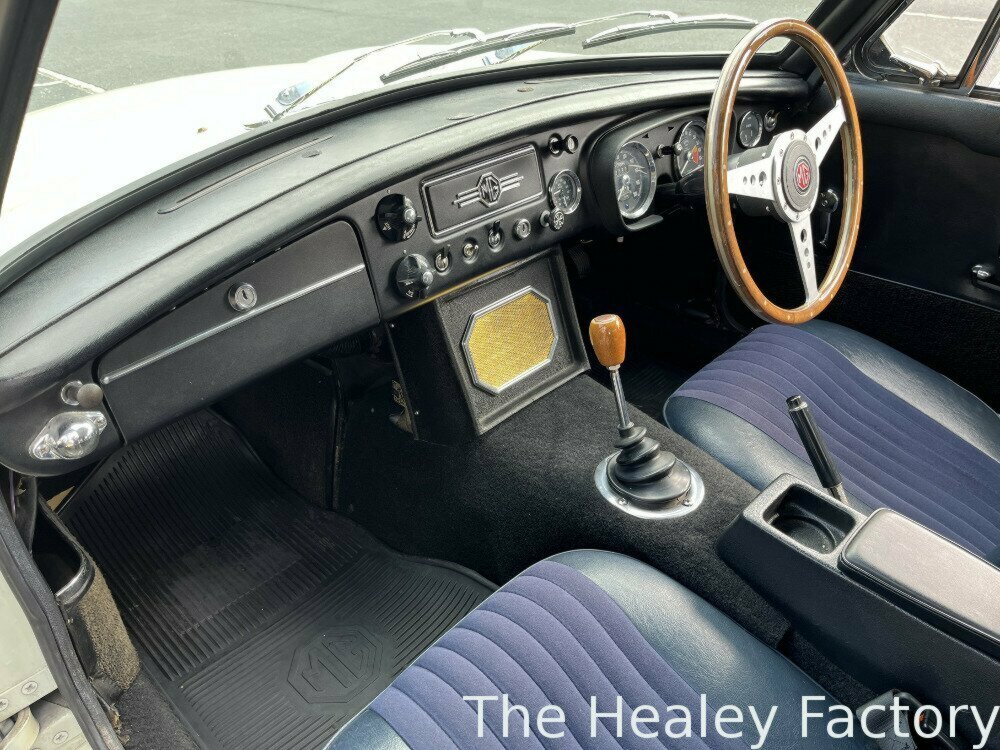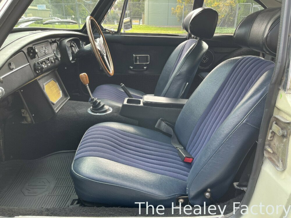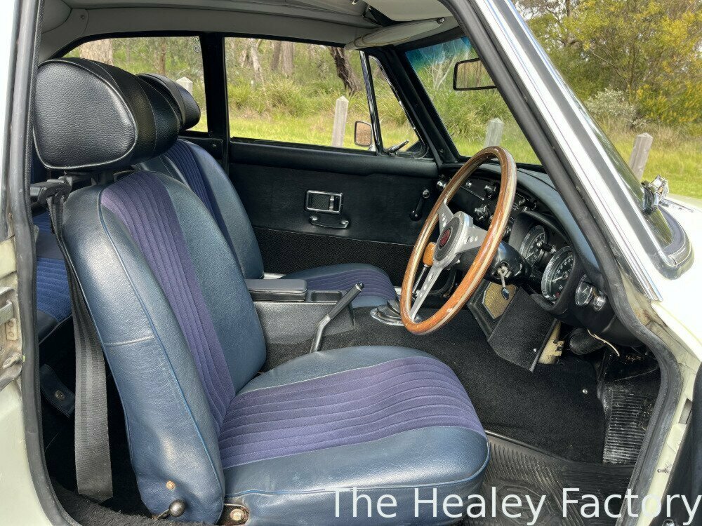 The ‘Ivory’ coachwork of this MGB GT is set off by its sparkling chrome wire wheels complemented by the gleaming brightwork. The Blue interior features more comfortable, later style, reclining seats with the added safety of head restraints and inertia seatbelts, a period wood-rimmed steering wheel, an optional ‘Smiths’ heater and the added luxury of a ‘Slideaway’ vinyl sunroof.
