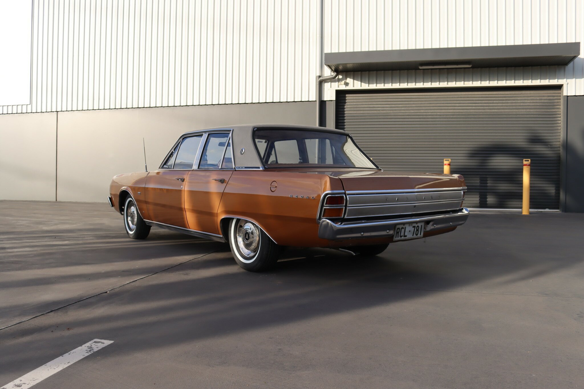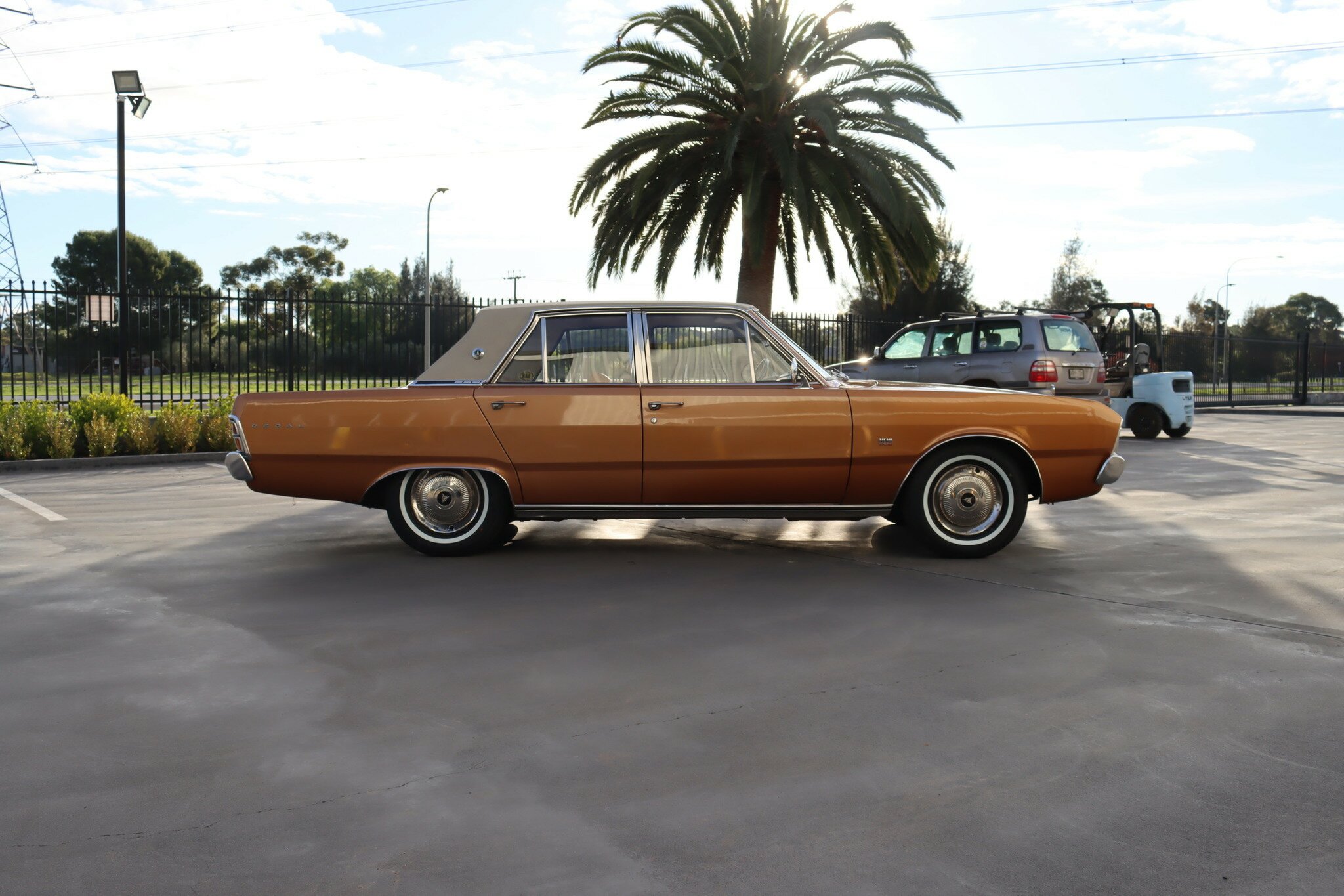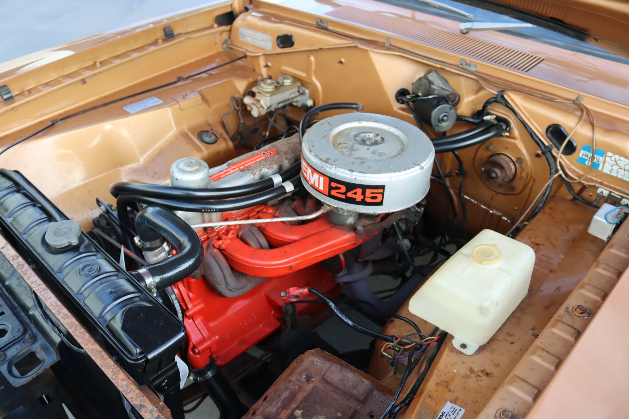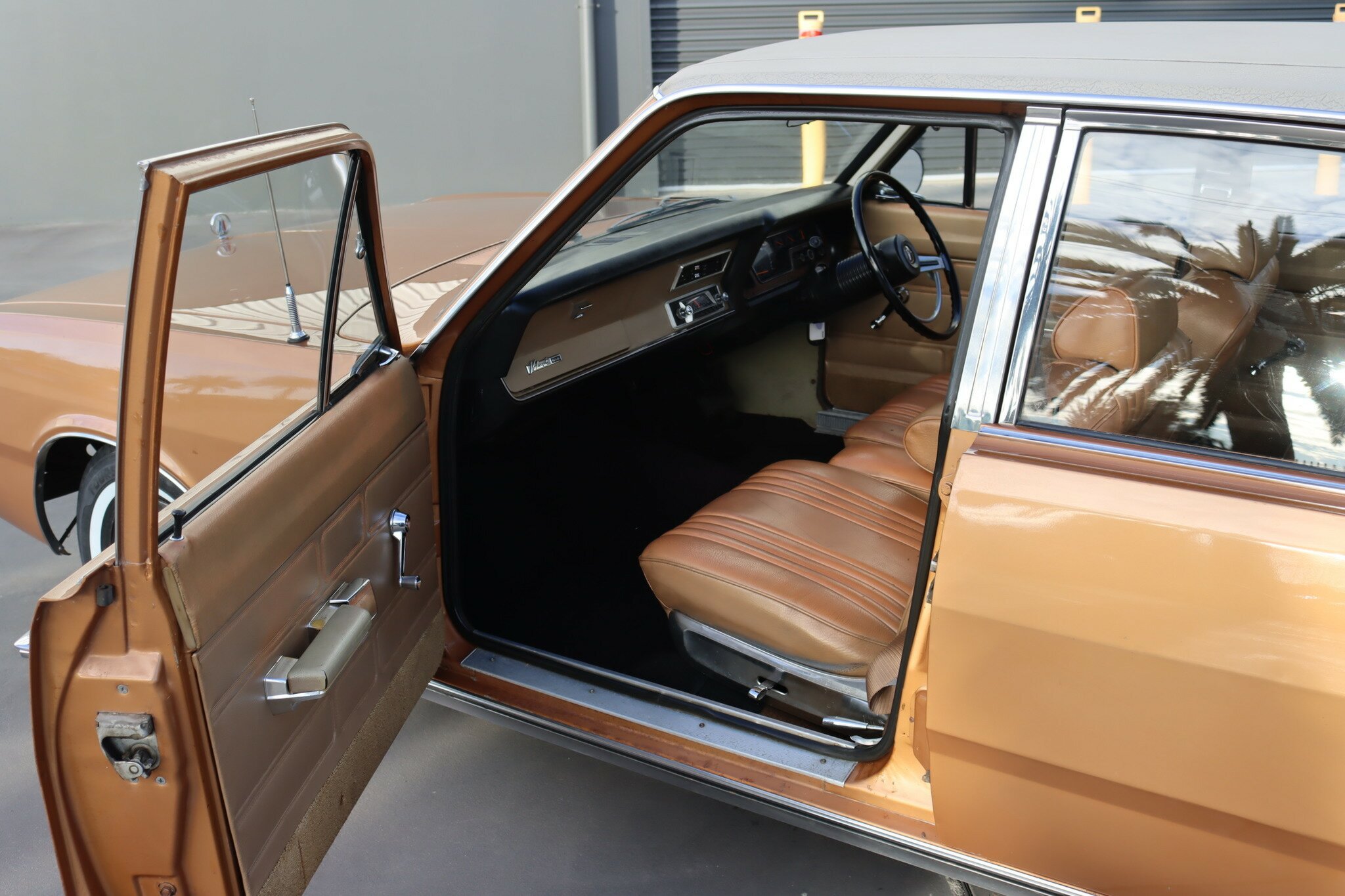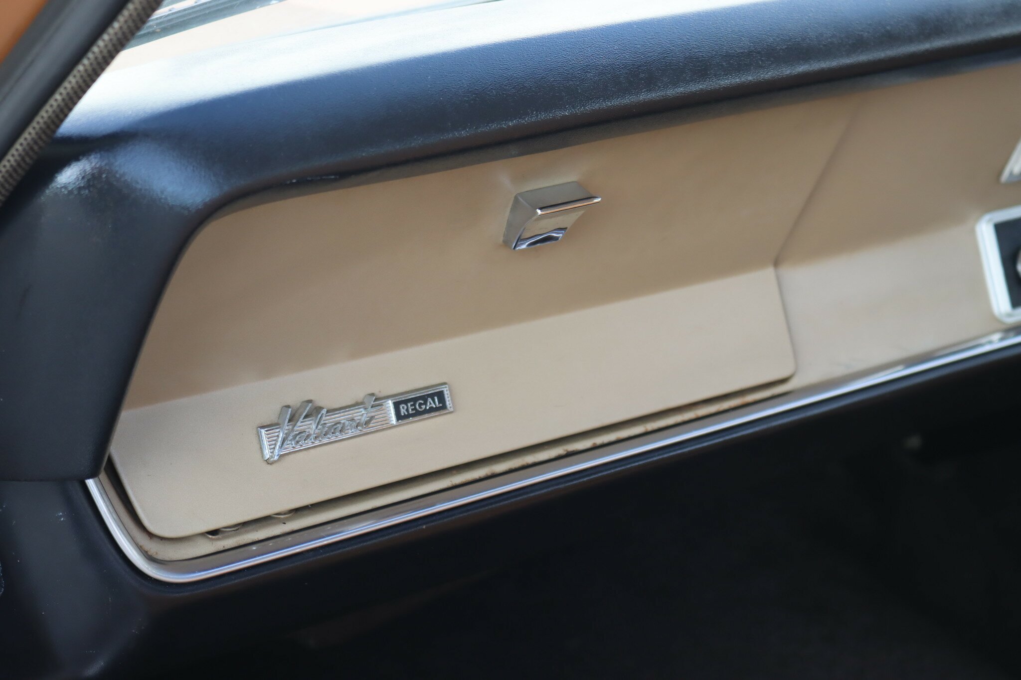 VG Valiant Regal 4 door Sedan. This is an original unrestored low mileage (90,835) car running the 245 Hemi 6cyl engine with 3spd auto trans. Very Good original condition with no rust. Exterior is presented in Spring Gold Metallic Paint in good original condition. Parchment vinyl roof with no tears or rips. Front bucket seats with fold down arm rest. Interior is Tan Parchment in good order.