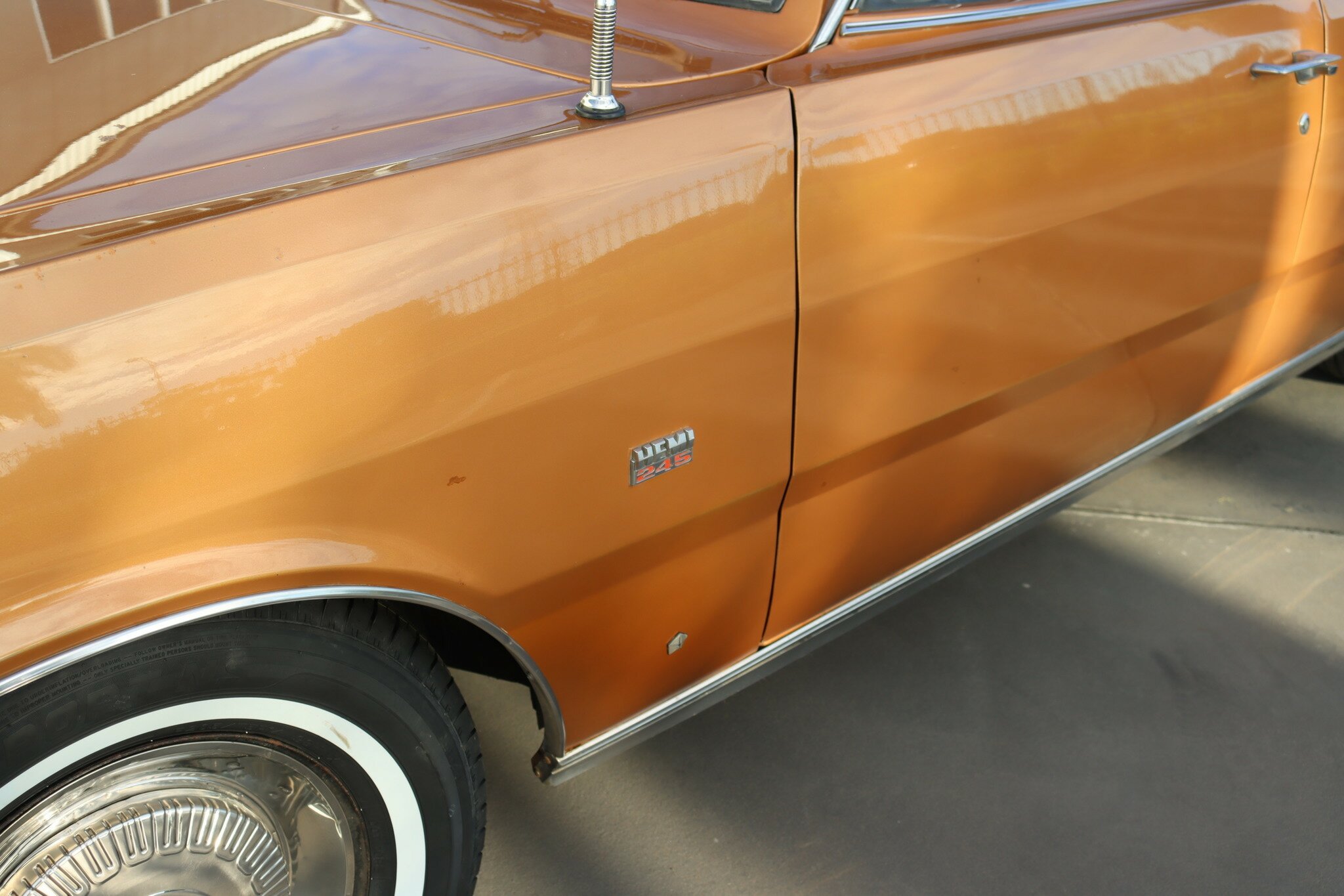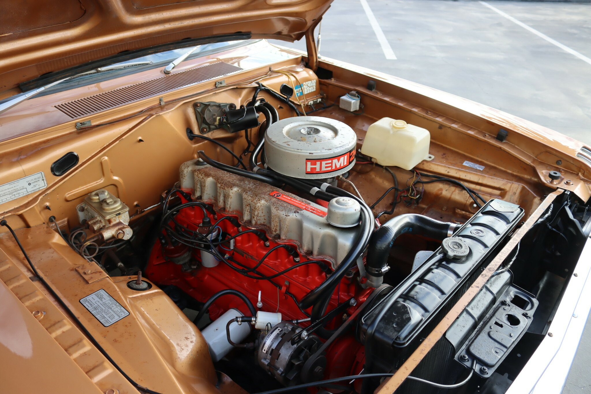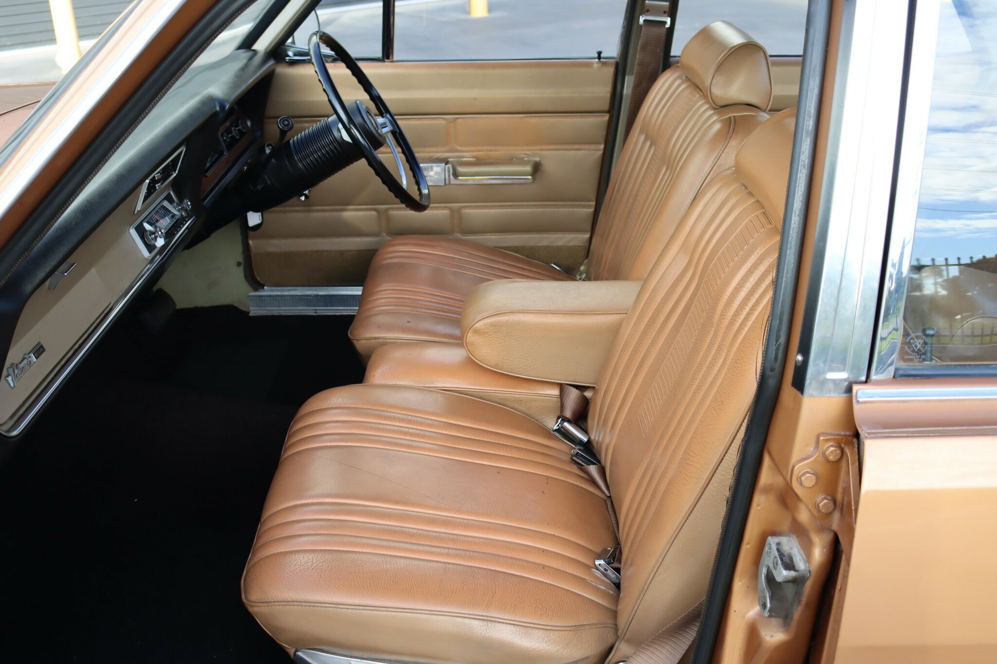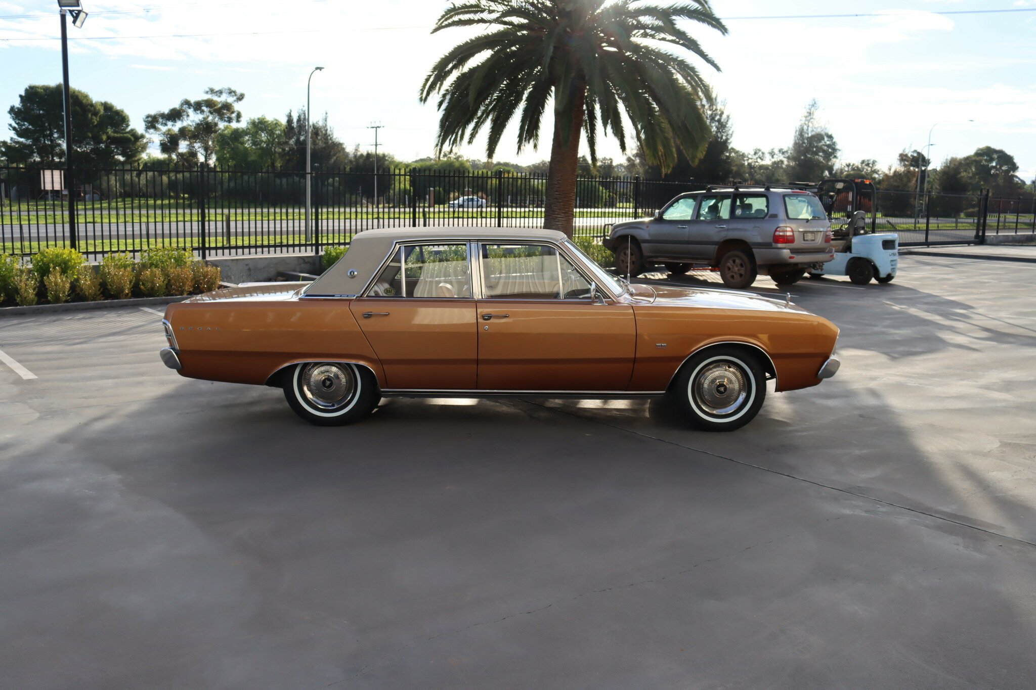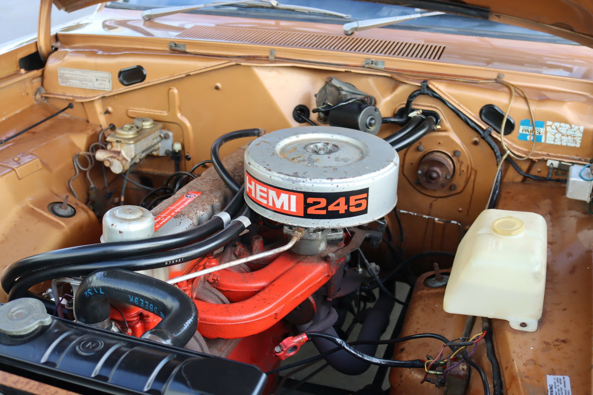 VG Valiant Regal 4 door Sedan. This is an original unrestored low mileage (90,835) car running the 245 Hemi 6cyl engine with 3spd auto trans. Very Good original condition with no rust. Exterior is presented in Spring Gold Metallic Paint in good original condition. Parchment vinyl roof with no tears or rips. Front bucket seats with fold down arm rest. Interior is Tan Parchment in good order.