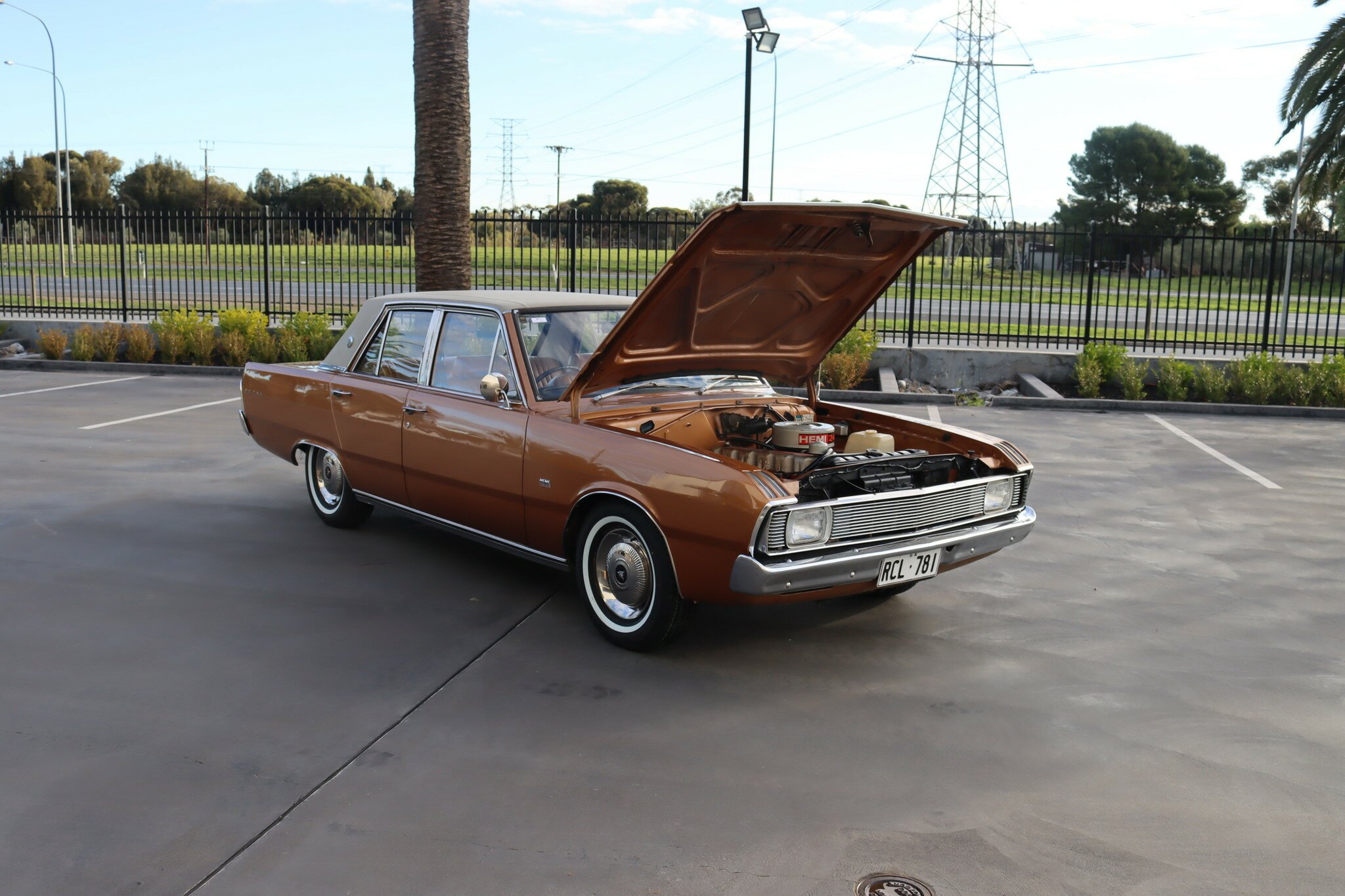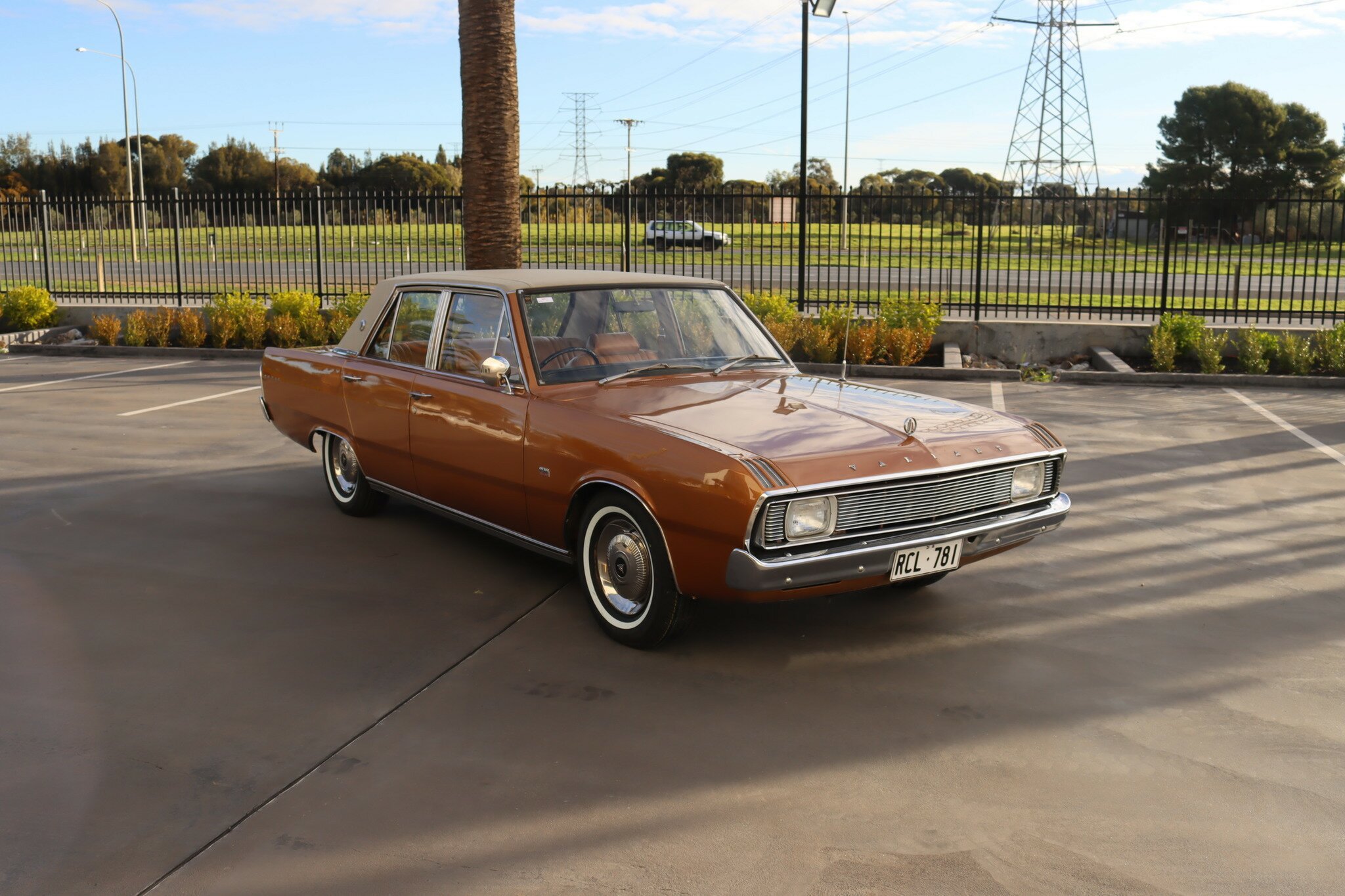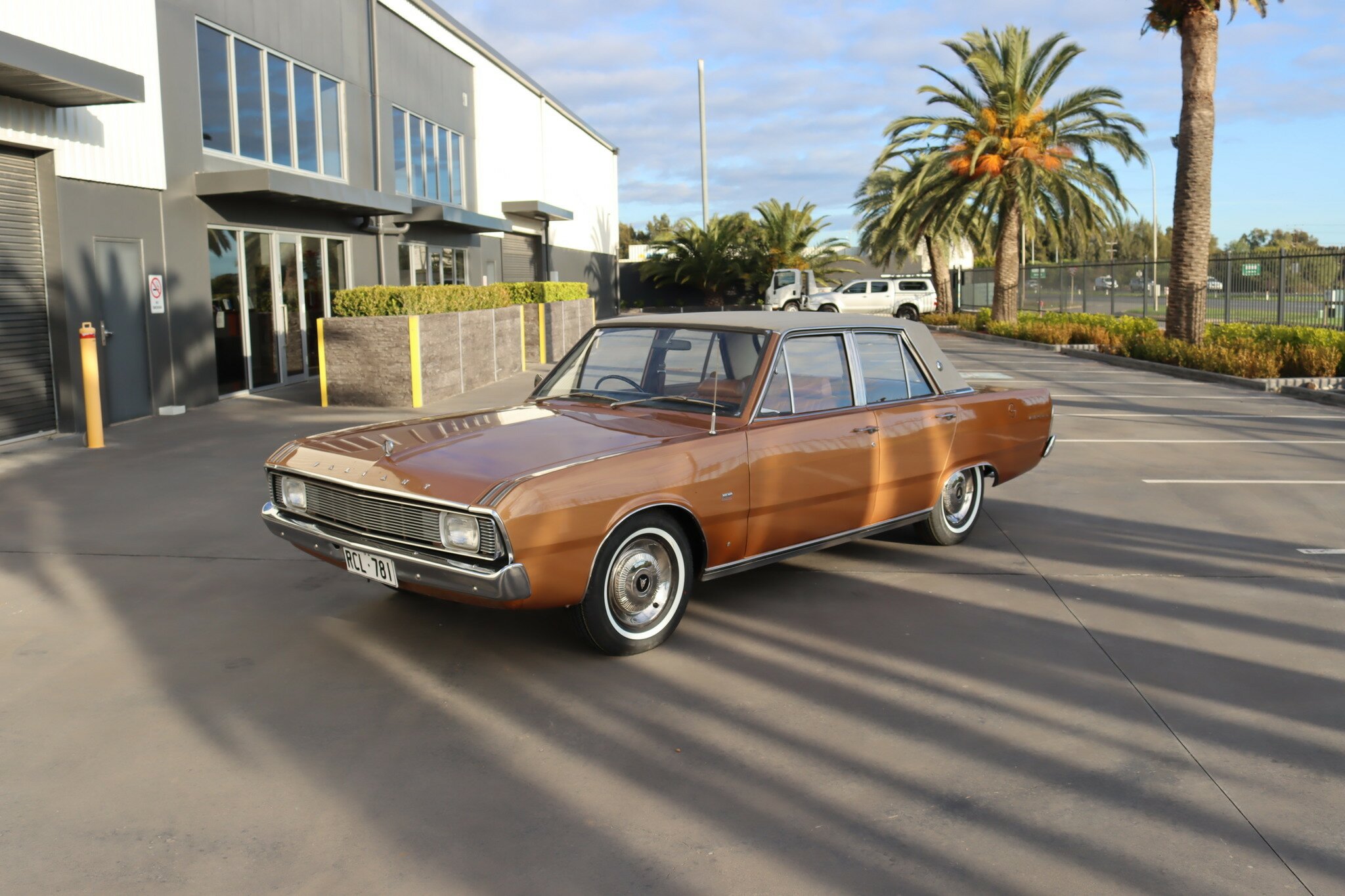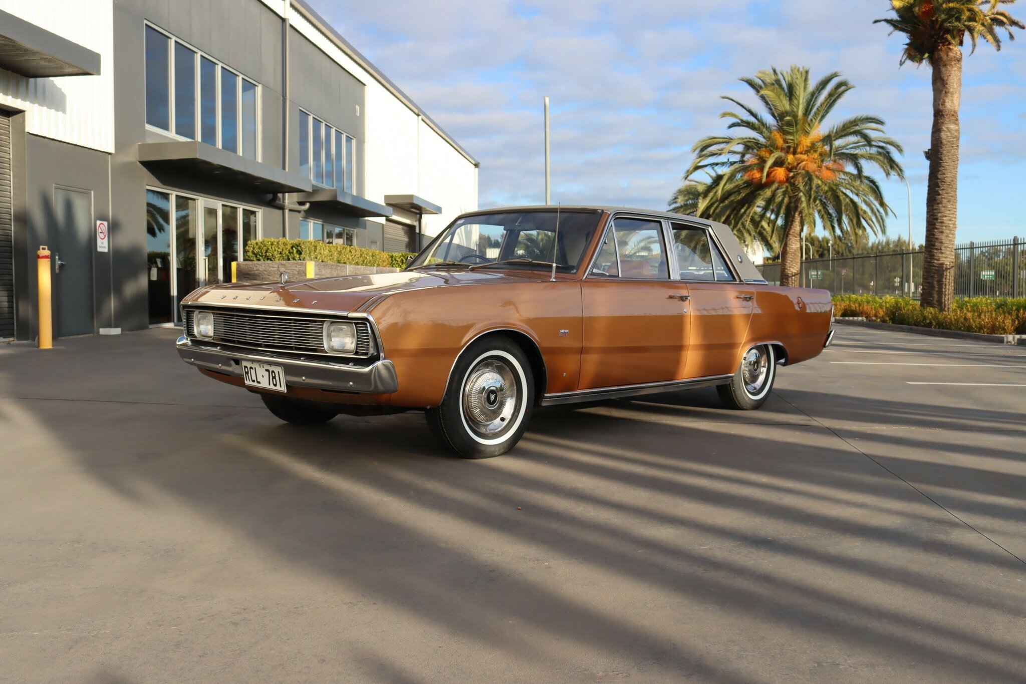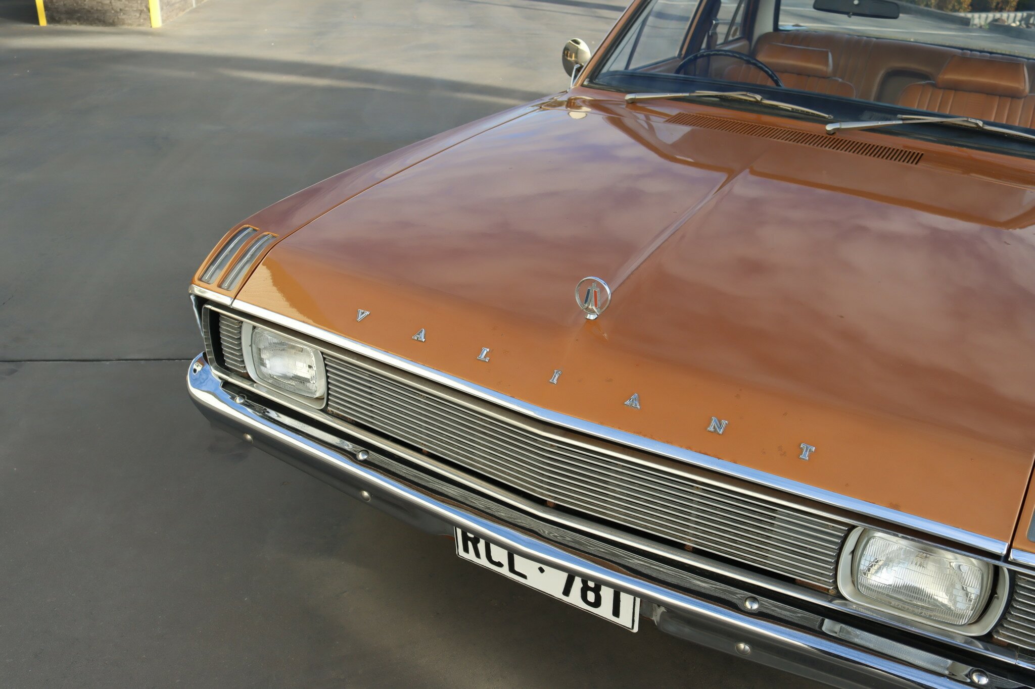 VG Valiant Regal 4 door Sedan. This is an original unrestored low mileage (90,835) car running the 245 Hemi 6cyl engine with 3spd auto trans. Very Good original condition with no rust. Exterior is presented in Spring Gold Metallic Paint in good original condition. Parchment vinyl roof with no tears or rips. Front bucket seats with fold down arm rest. Interior is Tan Parchment in good order.