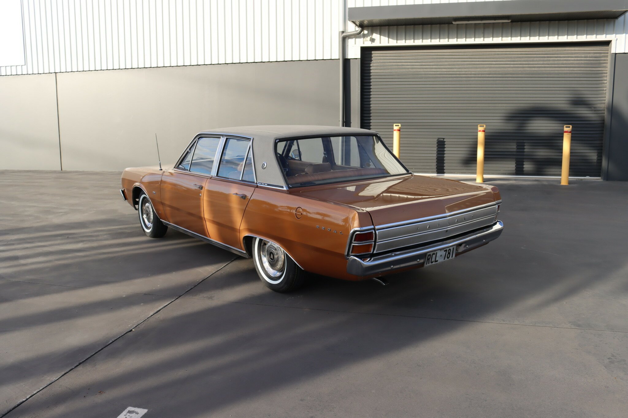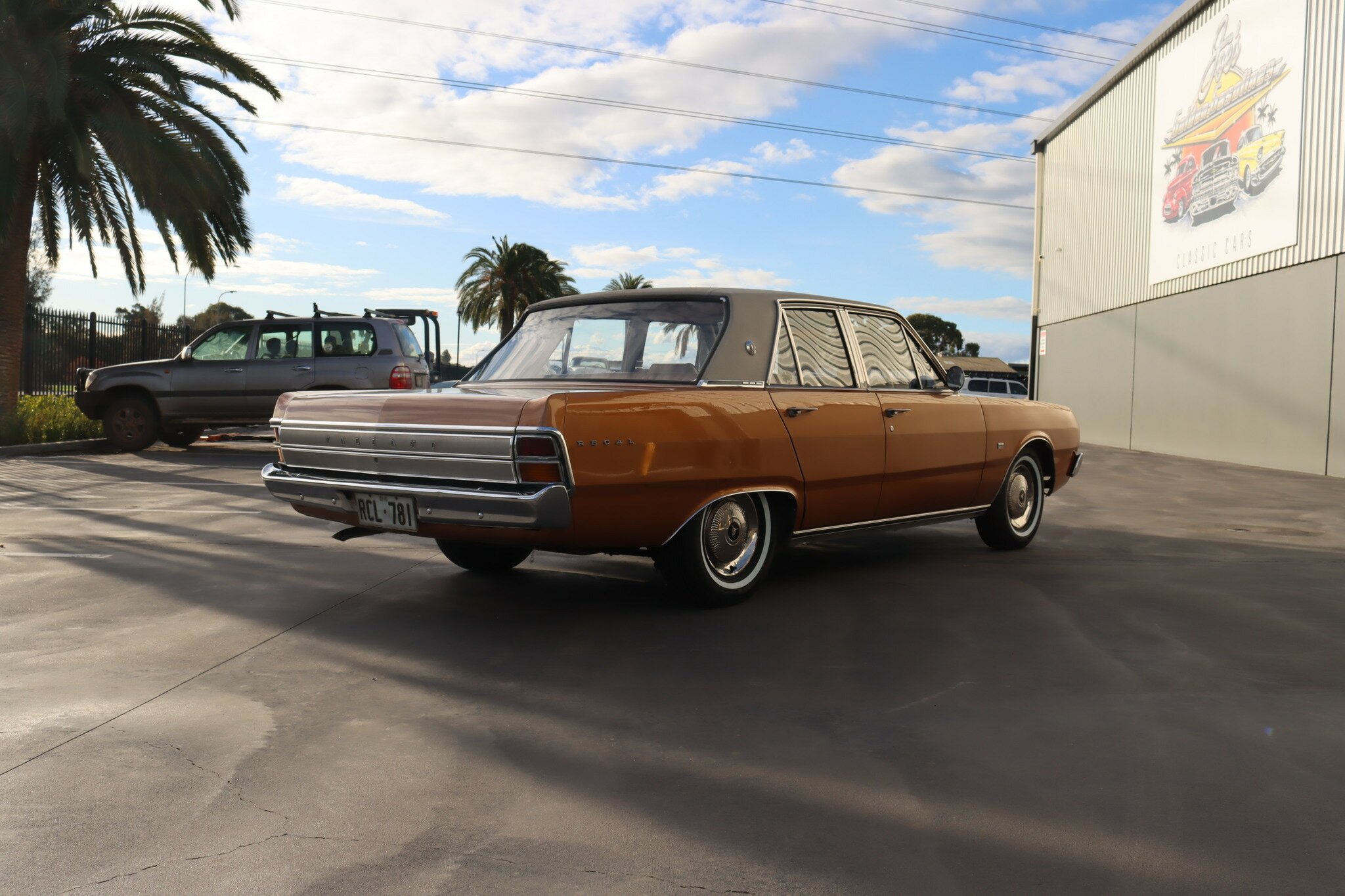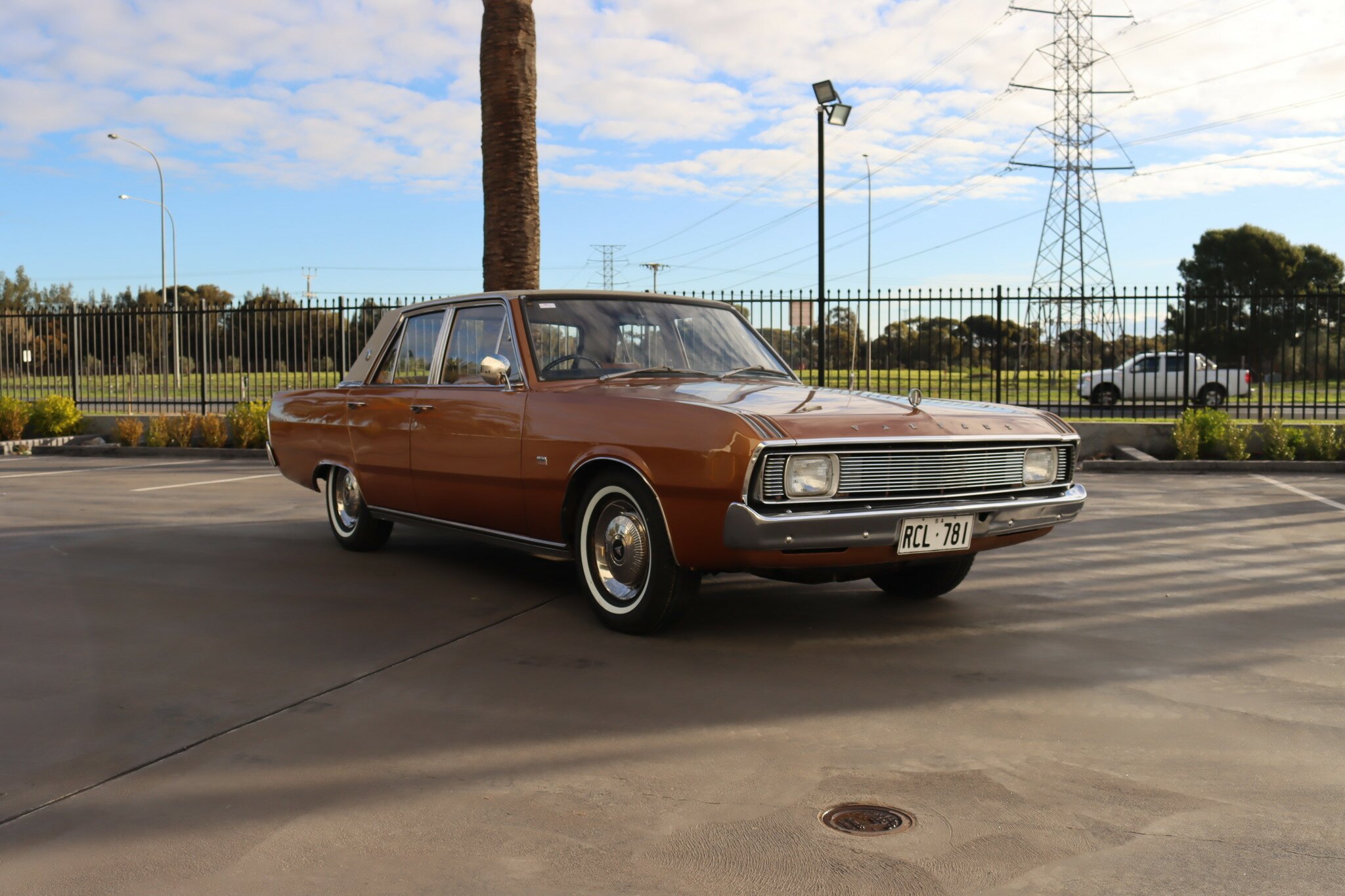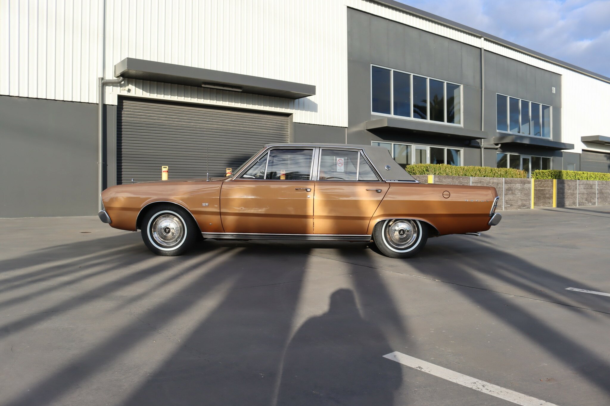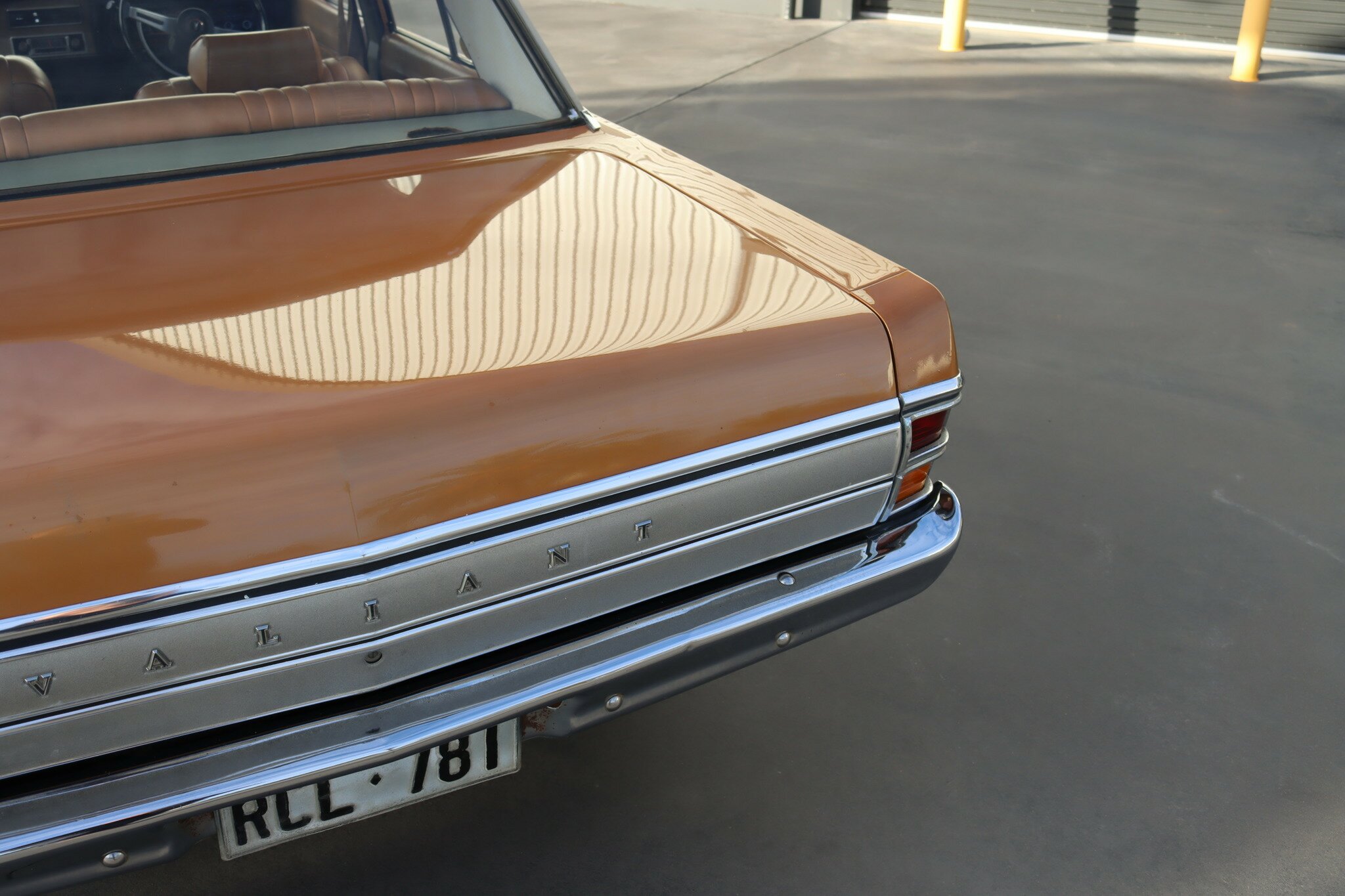 VG Valiant Regal 4 door Sedan. This is an original unrestored low mileage (90,835) car running the 245 Hemi 6cyl engine with 3spd auto trans. Very Good original condition with no rust. Exterior is presented in Spring Gold Metallic Paint in good original condition. Parchment vinyl roof with no tears or rips. Front bucket seats with fold down arm rest. Interior is Tan Parchment in good order.