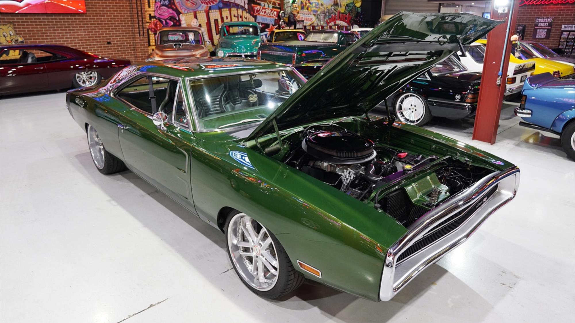 HIGHLIGHTS: - Custom Restomod style 1970 Dodge Charger - Repainted in Metallic Green with satin black stripes - Rebuilt 440ci V8 engine - Holley Sniper fuel injection - Rebuilt 727 Automatic transmission with Piston Grip shifter - Factory differential - Rebuilt suspension - Power steering - Power disc brake front - Refinished interior trim with Recaro CS bucket seats trimmed to match factory - Dakota Digital gauges - Air conditioning - Reverse Camera - Retrosounds Bluetooth stereo - Custom fully forged BLZA Staggered 20" wheels
