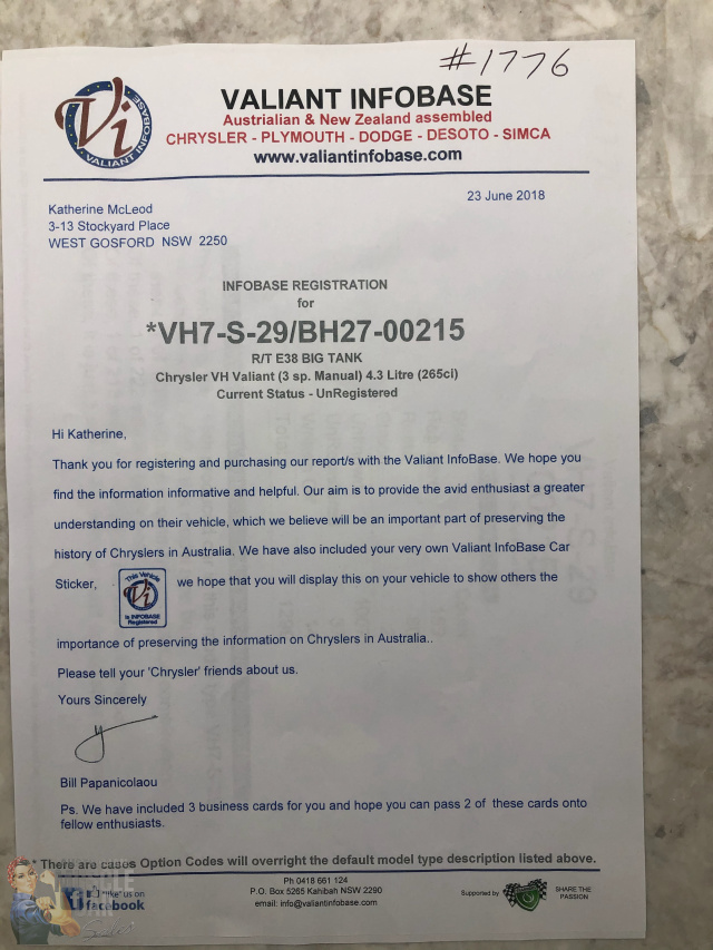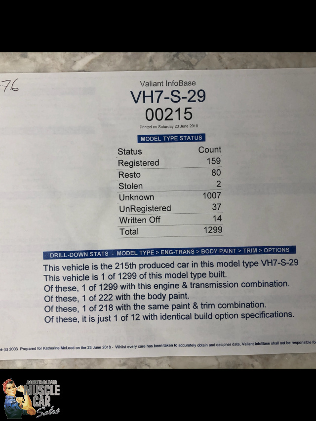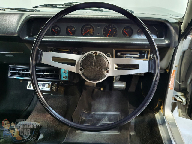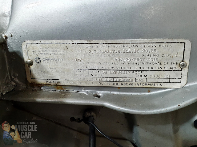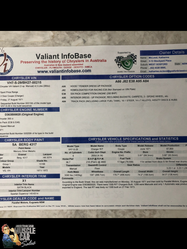 Purchased from the Gosford Car Museum in 2018. Excellent unmolested Valiant R/T Charger E38 6 Pack Big Tank. One of only 224 Big Tank E38s built in 1971 and one of only 12 with the same build specifications. Supposedly only 159 remain today. Originally sold through Parallel Motors, Eugowra, NSW this classic Mercury Silver E38 has had a doors-closed repaint which still presents extremely well on a perfect original straight body, with very nice original Black interior trim, carpets, seat belts, dash with working underdash air-conditioning. Under the bonnet is the legendary and numbers matching Chrysler 265 cubic inch Hemi six cylinder engine topped by the three maestro tuned Weber masterpieces from Bologna, Italy with original air filter elements still in place. The sound is still magnificent.The stand out feature of the A84 Track Pack option is the 35 gallon 160 litre Bathurst tank, still strapped purposefully into the boot, no-nonsense work by Chrysler engineers of the day. The twin external fillers still give the game away and is all class. The car is mechanically perfect with original hard to find 3 speed gearbox still in it's rightful place. This is the one for the Charger purist. Ready for any inspection, in our Kingsgrove, Sydney Showroom. And if you are unable to travel due to Covid restrictions, AMCS will gladly arrange a video inspection/road test of the car using WhatsApp, and of course there is no issue with door to door freight delivery anywhere in Australia or New Zealand. (Ref. 5563)