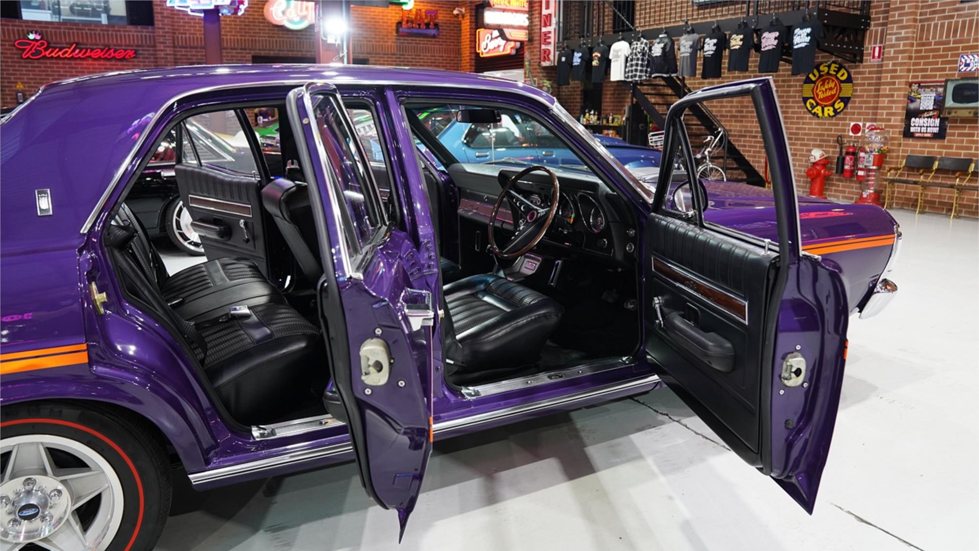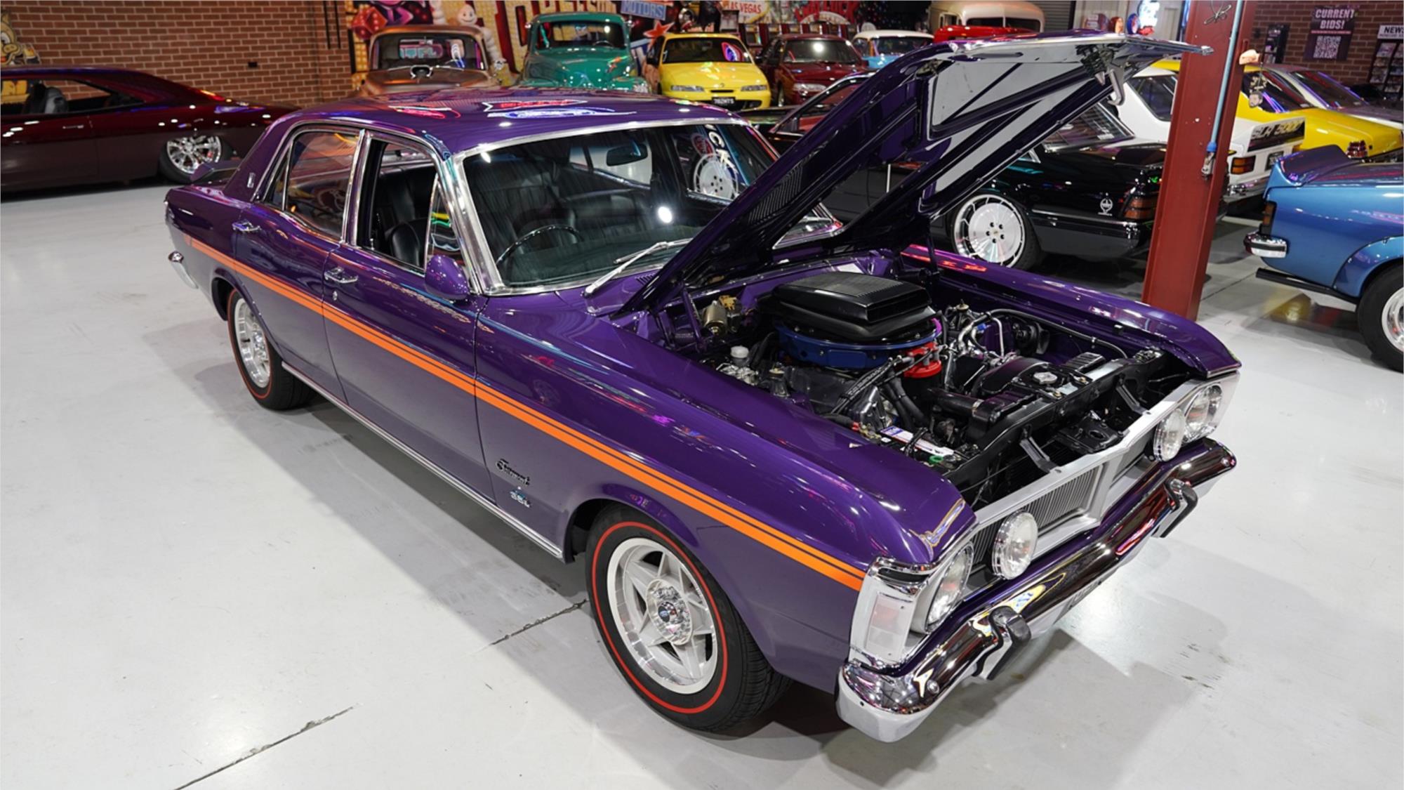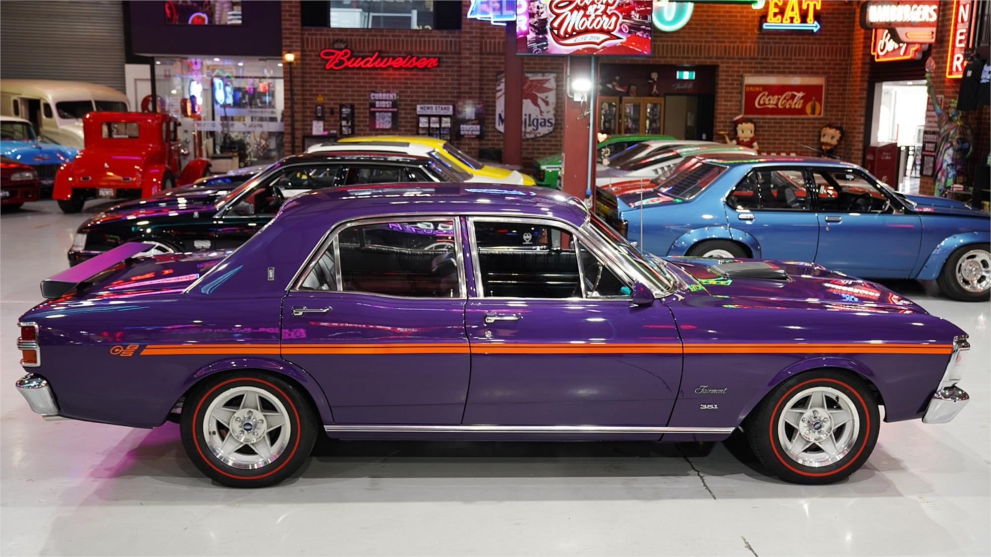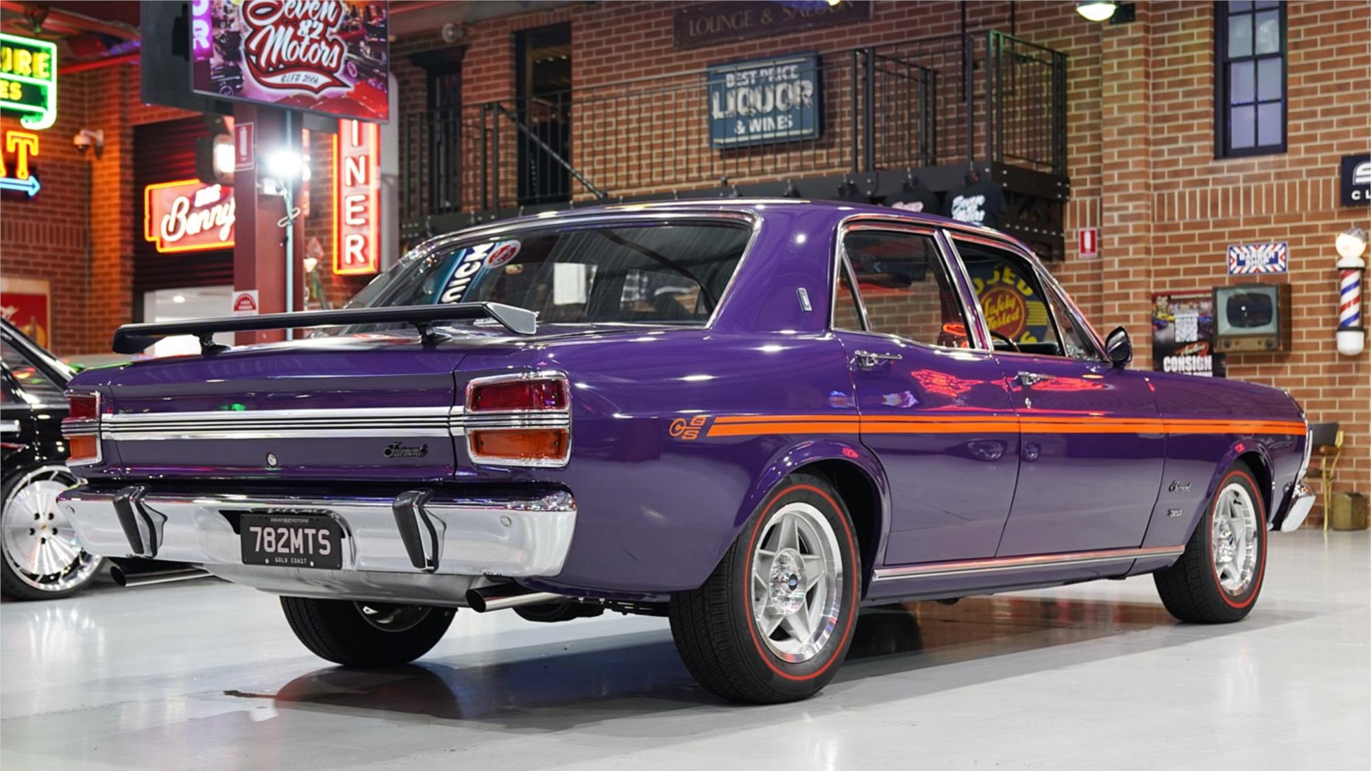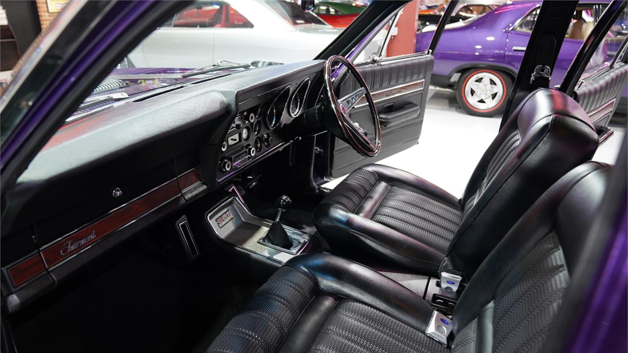 HIGHLIGHTS: - Highly desirable XY Fairmont GS – Repainted in factory colour Wild Violet with orange GS stripe - Rebodied early in its life – Refinished Fairmont interior in Black Vinyl – Matching numbers 351ci Cleveland V8 engine - Tremec TKX five speed manual transmission – Nine-inch with Tru-trac limited slip centre with 3.25 ratio – Air conditioning – Retrosounds Bluetooth stereo system – New 15" Bathurst Globe wheels with red stripe tyres - Letter from Ford to confirm original specification