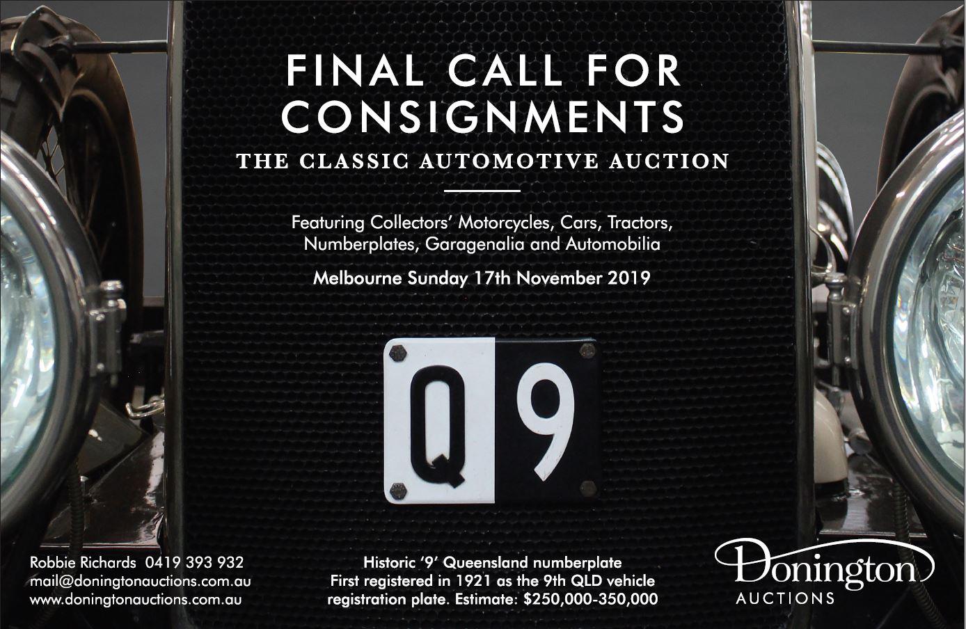 Final call for consignments. Featuring collectors motorcycles, cars, tractors, number plates, garagenalia and automobilia. https://www.doningtonauctions.com.au/